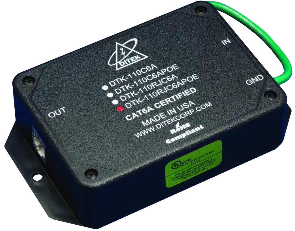 DITEK’S DTK-110C6APOE IS A CAT6A SURGE PROTECTIVE DEVICE (SPD) THAT PROVIDES MAXIMUM PROTECTION TO POE CIRCUITS TRANSMITTING VIDEO & DATA OVER CAT5E, CAT6 OR CAT6A CABLING