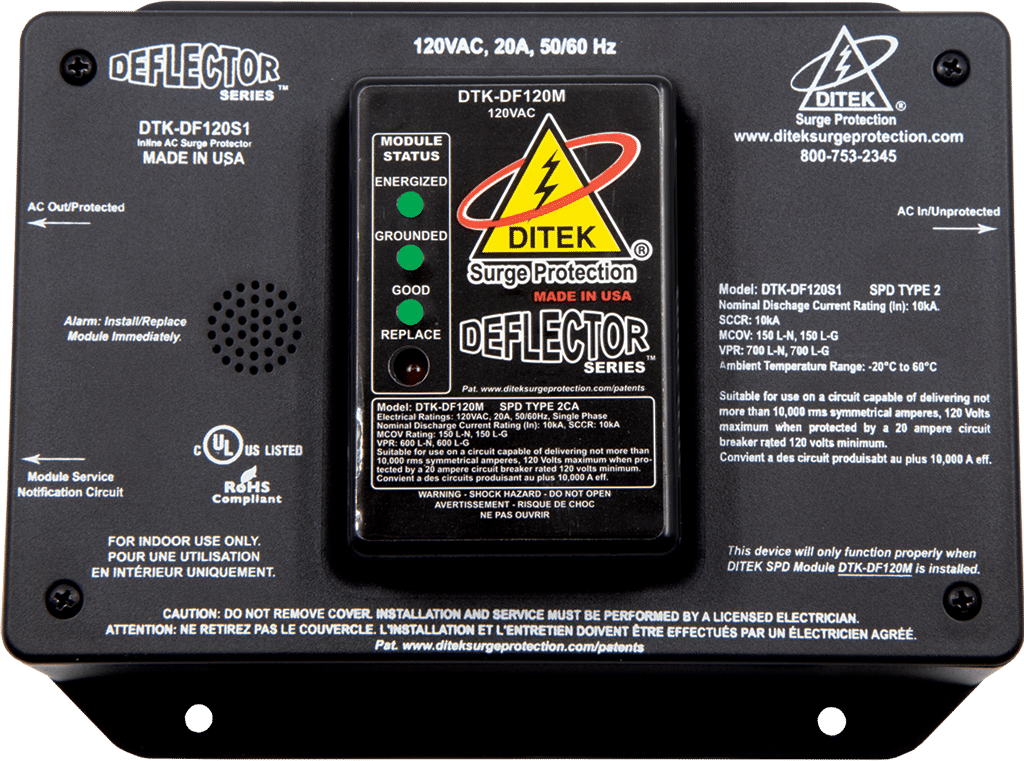 DITEK’S DTK-DF120S1 SETS A NEW STANDARD FOR 120VAC POWER SURGE PROTECTION. THE PATENTED DESIGN PROVIDED MAXIMUM CRITICAL LOAD PROTECTION BY MINIMIZING AC SUPPLY VOLTAGE SPIKES AND ISOLATING INCOMING SURGES THAT ORIGINATE FROM LIGHTNING OR OTHER SOURCES. EACH DF SERIES MODULES FEATURES AN LED HEALTH STATUS INDICATOR THAT FLASHES AND SOUNDS AN AUDIBLE ALARM WHEN PROTECTION HAS BEEN COMPROMISED.